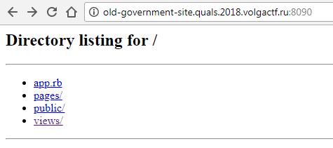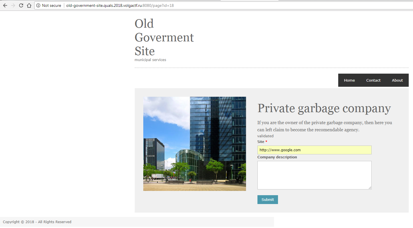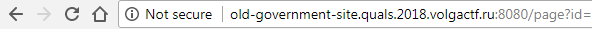 This is my writeup for the Web 150 VolgaCTF 2018 Quals challenge named "Old Government Site". In this challenge, users are presented with an "old government site" that looks like the following: