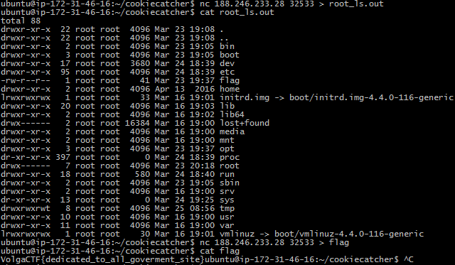 Although it didn't contain the flag, it still validated my command injection approach. Many injections and netcats later, I found a file named "flag" in the root directory: